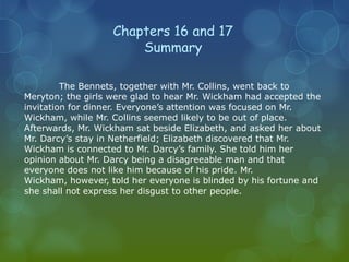 62 rows Chapter 17. He even has designs on Lizzys hand in marriage. 357K subscribers Pride and Prejudice Chapter 17 summary and analysis in one minute by Professor Bradley Greenburg of Northeastern Illinois University.